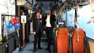 Affärsområdeschef Bram Lauwers och affärschef Almir Emrovic i en dekorerad buss.